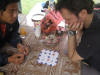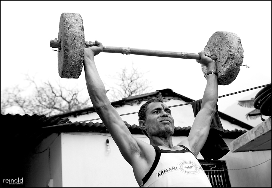 Die Wirtsleute des Maya-Hotels sind zwei junge Leute mit zwei Kindern im Alter von 6 und 10 Jahren. Der Mann ist ein Unikum. Mit seinen rötlich gefärbten Haaren sieht er nicht gerade nepalisch aus. Als er uns hinter dem haus sein "Fitnessstudio" zeigt kommen wir aus dem Staunen nicht mehr raus. Aus Stein hat er sich eine Langhantel und Kurzhantel gebastelt und zeigt uns was er damit so alles anstellen kann. Man sieht seinem Körper das Training an.