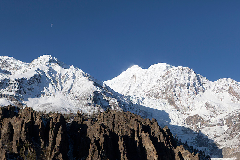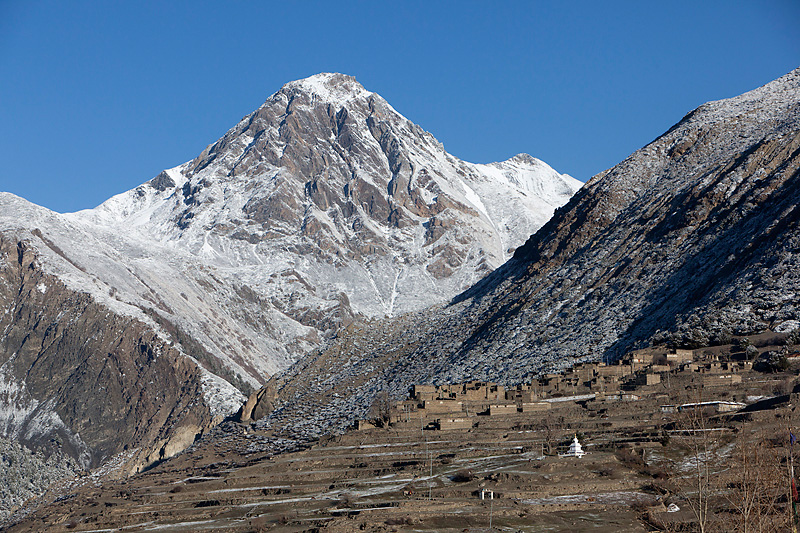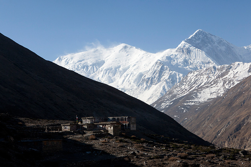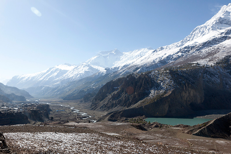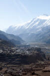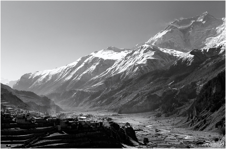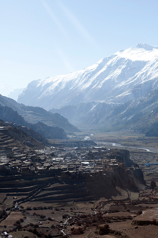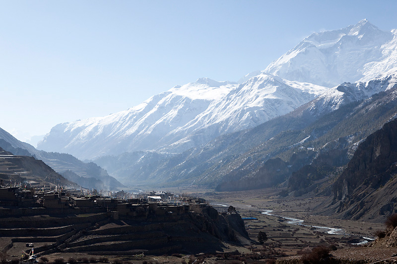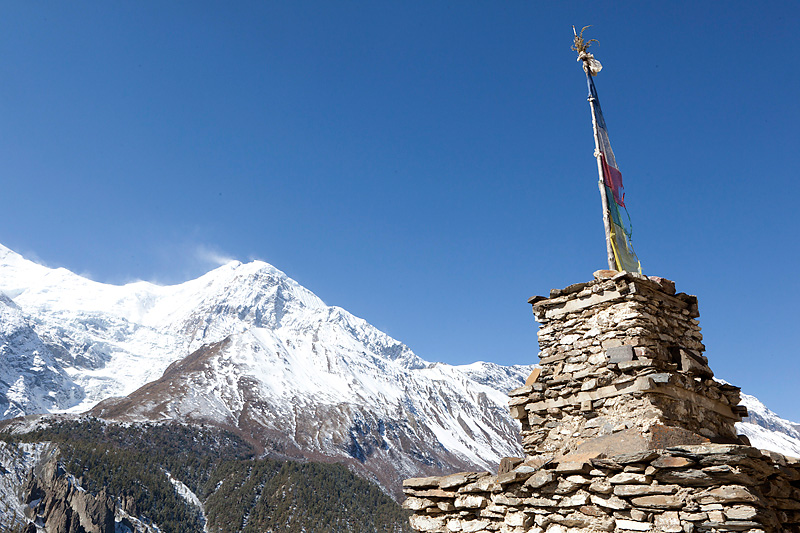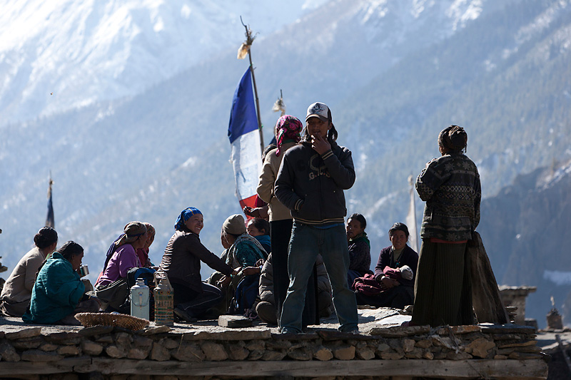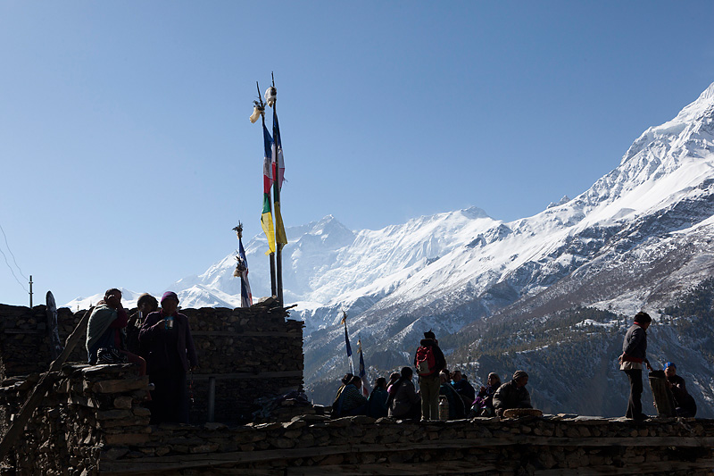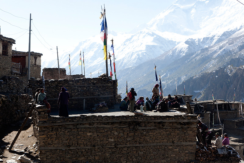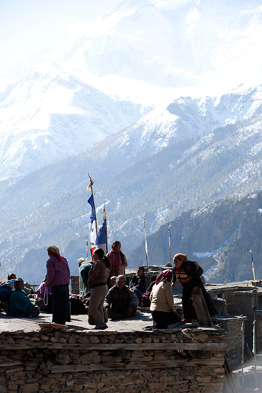 Nachdem wir gut gefrühstückt haben, machen wir uns auf den Weg zu unserem heutigen Etappenziel nach Ledar mit einem Höhenunterschied von 700 Metern. Heute werden wir die 4000er Grenze knacken. Wir steigen bergan bis nach Upper Manang. Doch scheint eine große Feierlichkeit zu sein. Schon auf dem Weg überholen uns einige Einheimische, die wir dann dort wieder treffen. Auf den Dächern des Ortes sind jede Menge Menschen. Wir schauen uns das Spektakel etwas an, bevor wir uns auf den Weiterweg machen.