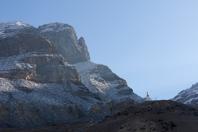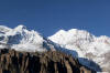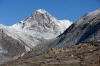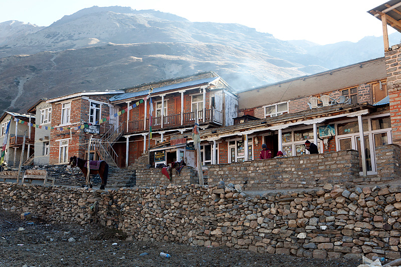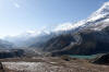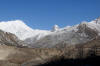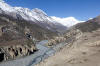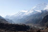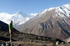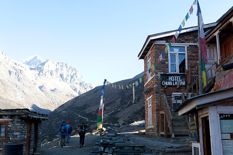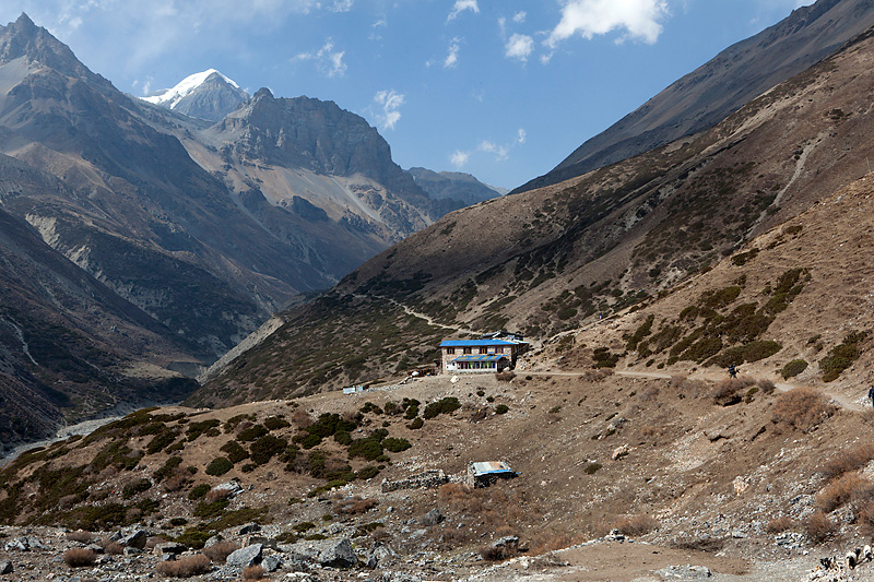 In Ghusang auf 3900 Metern Höhe machen wir dann eine längere Teepause. Trinken wird jetzt in der Höhe immer wichtiger. Um 11Uhr machen wir uns wieder auf den Weg. Die nächsten 2 Stunden geht es nur leicht bergan, vorbei am Zeltplatz für den Aufstieg auf den Chulu, den wir auf der rechten Wegseite nun sehen können. In Yak Kharka auf 4000 Metern Höhe machen wir dann in einer Lodge Mittagspause. Auch hier lassen wir uns Zeit. Bis nach Ledar ist es von hier aus nur noch eine gute Stunde. Kurz vor Ledar überqueren wir noch einmal einen Seitenfluss des Marsyandi. Es wird die letzte Brücke bis bis Pass sein. Von Yak Kharka bis Ledar geht es noch einmal leicht bergan, aber die 200 Höhenmeter sind kein Problem. Ledar selbst besteht nur aus 2 Lodges, einer oberen und einer unteren. Wir nehmen die untere, das Hotel Churilatte. Hier oben spüren wir richtig die Kälte. Der Ofen wird erst gegen Abend angemacht und so frieren wir ein wenig vor uns hin. Um unseren Flüssigkeitshaushalt zu bedienen wird eine Kanne Lemontea nach der anderen getrunken. Die Lodge war natürlich ziemlich voll mit Touristen. Neben unseren "alten" Bekannten, trafen wir hier aber auch neue Gesichter. Zum Beispiel Micaela, eine amerikanische Krankenschwester aus Kalifornien, die im Krankenhaus in Manang ein 3monatiges Praktikum machte. Sie hatte ein paar Tage frei und war auf dem Weg, um sich Muktinath anzuschauen. Gleichzeitig nutzte sie den Trip über den Thorung La, um die Touristen über eventuelle Höhenprobleme zu interviewen. Micaela wurde in den nächsten Tagen unsere ständige Reisebegleiterin.