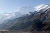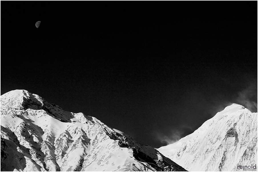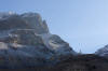 Am nächsten Morgen stehen wir gegen 6:30 Uhr voller Spannung auf. Wie hat sich das Wetter über Nacht entwickelt? hat es weiter geschneit? Könne wir weiter gehen? Ein Blick aus dem Fenster lässt mich jubeln. Strahlend blauer Himmel ist draußen. Vom dach der Lodge hat mein einen gigantischen Blick auf die Eisriesen. Die umliegenden Berghänge sind mit einer leichten Puderzuckerschicht überzogen, aber überhaupt kein Problem für den Weiterweg.