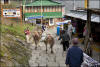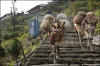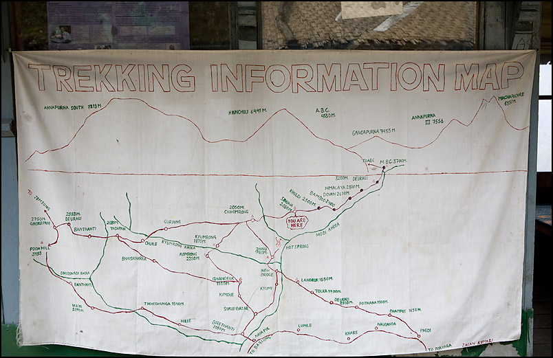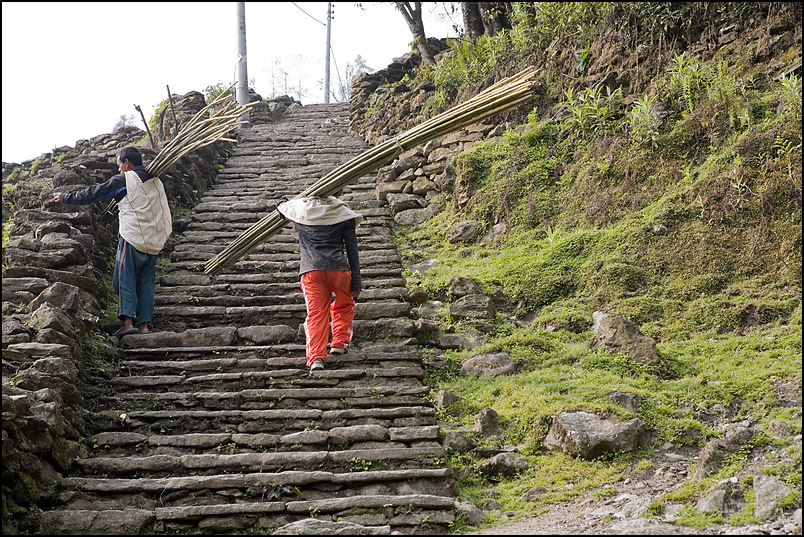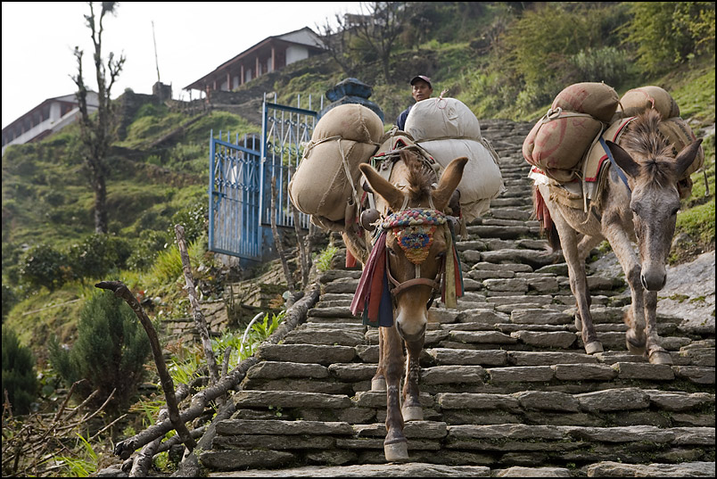 Bamboo - Himalaya Hotel Ein Doppelklick auf ein Foto vergrößert das Bild! Am nächsten Morgen werde ich von Hari geweckt. Ein wunderschöner Blick auf das Annapurnamassiv, den Hiunchuli und den Machapuchre sind der Lohn für das frühe Aufstehen. Nach dem Frühstück beginnt eine weitere lange Tagesetappe. Zunächst geht es wieder mal bergab, mit dem Wissen, dass wir das alles auch wieder hoch müssen. Der erste Teil des Weges führt uns durch den Hauptteil von Chomrong. Wir haben gestern am Ortsanfang direkt auf der Bergkuppe übernachtet. Der Ort zieht sich von hier weit auseinander gezogen runter, bis fast an den Chomrong Khola. Uns begegnen an diesem Morgen einige Mulikarawanen, die voll beladen stur ihren Weg ziehen und einen unachtsamen Touristen mit ihren dicken Ladungen auch schon mal ordentlich anstupsen können. Man sollte deshalb immer darauf achten, dass man sich bei solchen Begegnungen auf der Bergseite aufhält. Außer den Mulis begegnen uns aber auch ganze Scharen von Trekkern. Noch nie habe ich in Nepal so viele Touristen gesehen, wie am heutigen Tag. Und alle scheinen das gleiche Ziel zu haben wie wir – das Himalaya Hotel. Da es dort nur zwei Lodges gibt, wollen unsere Träger vorgehen und die Zimmer dort reservieren. Prem, Birjar und Sandra ziehen los in einem Tempo, dem wir nicht folgen können – selbst wenn wir wollten.
