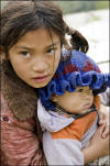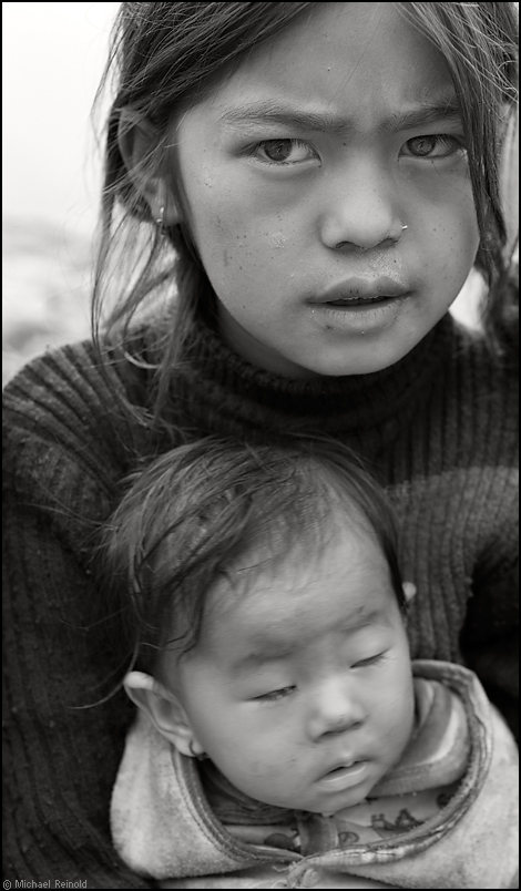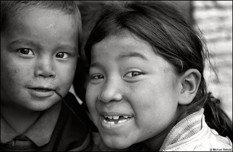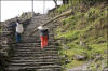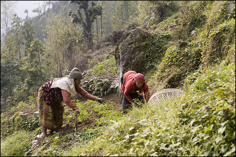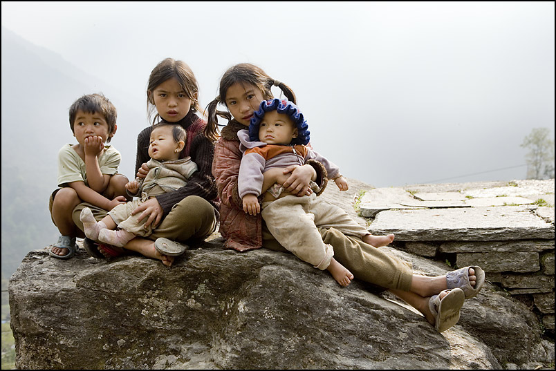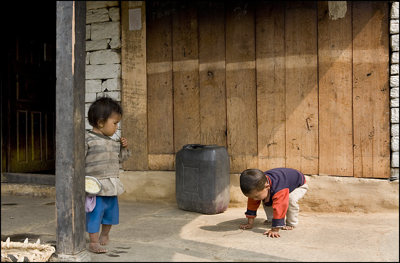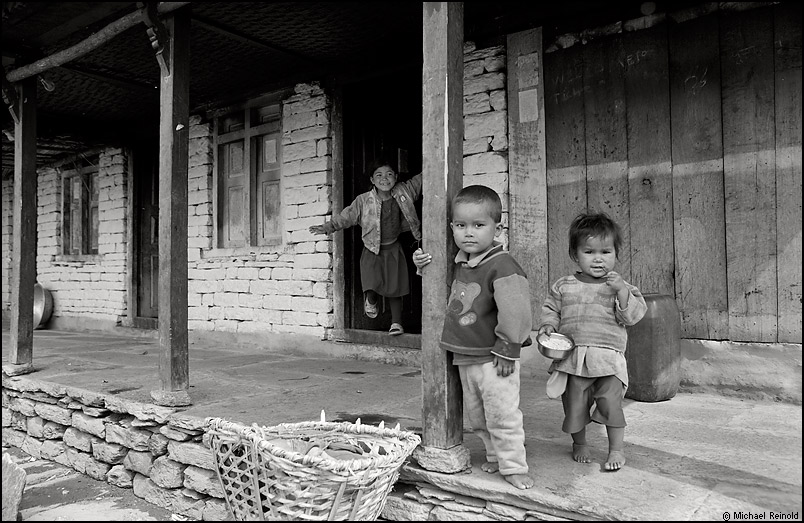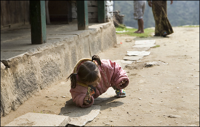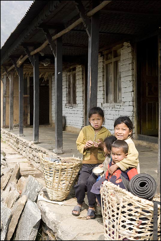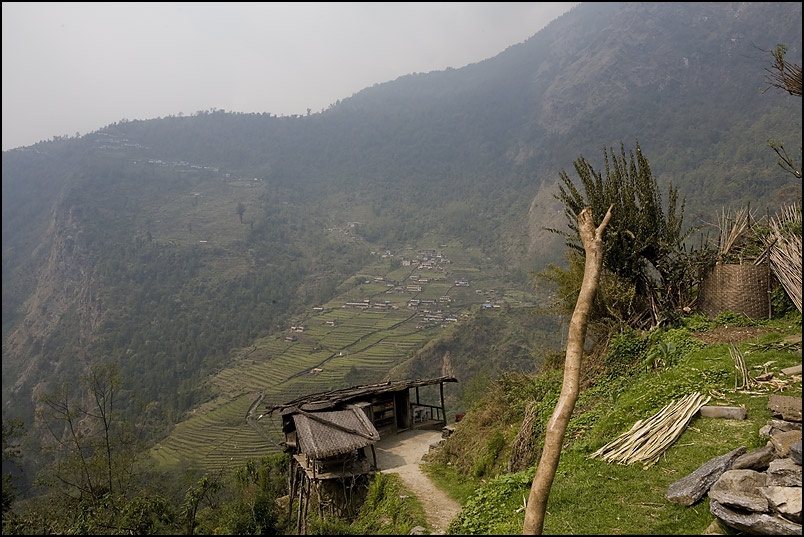 Bei unserem Abstieg zum Chomrong Khola kann man auf der anderen Hangseite schon den nächsten Ort unserer heutigen Etappe sehen. Um nach Sinuwa zu gelangen müssen wir aber die 400 Höhenmeter, die wir bis zum Fluss abgestiegen sind, wieder aufsteigen. Sinuwa besteht aus zwei Teilen. Der niedrigere Ortsteil, der von Chomrong aus zu sehen ist, liegt auf ca. 2050 Metern, der obere Ortsteil auf ca. 2400 Metern. Im unteren Teil von Sinuwa machen wir eine kleine Teepause. Noch ahnen wir nicht, dass wir hier bei unserer Rückkehr noch eine Menge Spaß bekommen sollen.