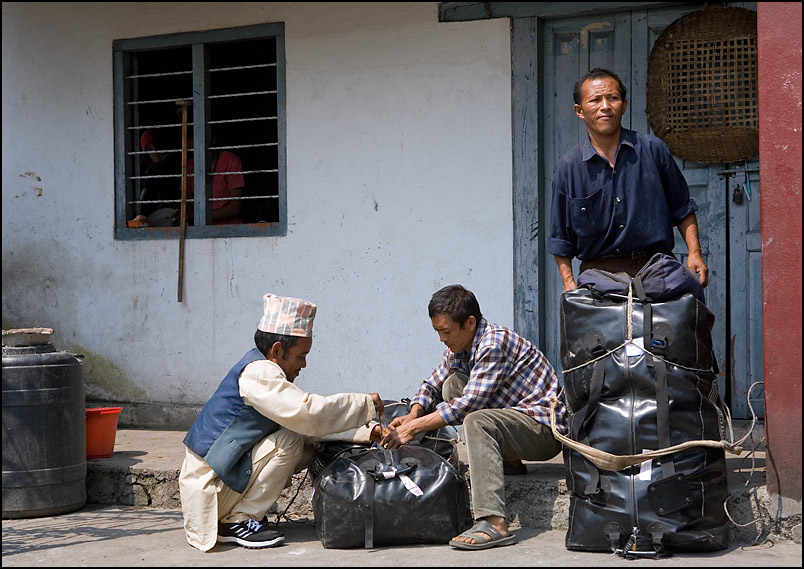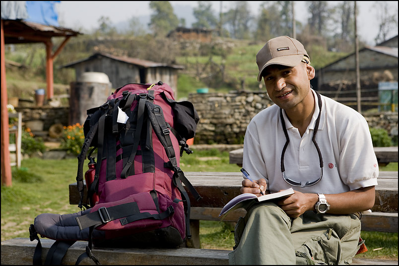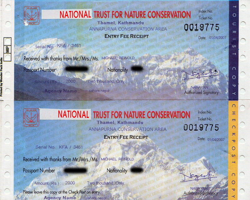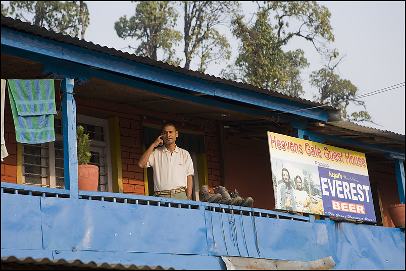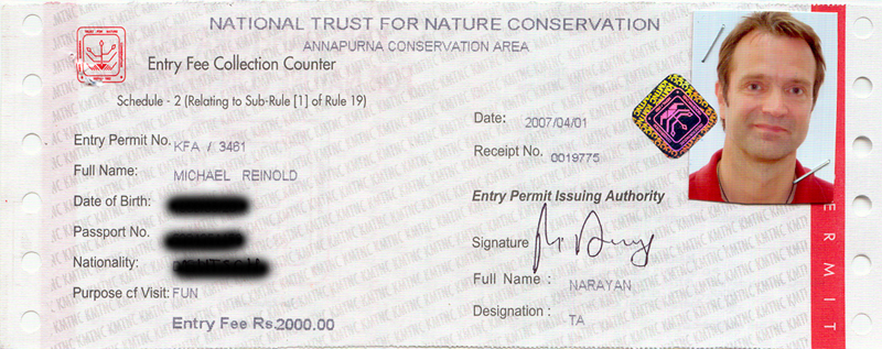 Dhampus - Pothana Ein Doppelklick auf ein Foto vergrößert das Bild! Die Tour ins Annapurna Sanctuary beginnt für uns in Phedi, einem kleinen Ort an der Strasse von Pokhara nach Beni, auf einer Höhe von 1130 Metern. Am frühen Morgen sind wir von Kathmandu mit Yeti Airlines nach Pokhara geflogen. Der Flug dauert ca. 30 Minuten. Alternativ kann man auch mit dem Bus in ca. 6 Stunden von Kathmandu nach Pokhara fahren. Eine interessante Variante wenn man genügend Zeit hat. Da unsere Zeit diesmal leider etwas knapper bemessen ist, haben wir uns für den Flug entschieden. Als wir am Flughafen in Pokhara landen, werden wir schon von unserer Trägermannschaft erwartet. Mein nepalischer Freund Hari, mit dem wir auch diesmal wieder unterwegs sind, hat alte Freunde aus vergangenen Touren als Porter angestellt. Prem und Birjar, mit denen wir im letzten Jahr lange Zeit in Mustang unterwegs waren, stehen schon am Ausgang und freuen sich sehr, uns zu sehen. Die Freude ist auch auf unserer Seite groß, denn wir haben sehr gute Erinnerungen an die Beiden. Sandra ist ein neuer Träger den wir noch nicht kennen. Er ist kurzfristig als Ersatz eingesprungen, da unser dritter Porter wegen des plötzlichen Todes seiner Mutter nicht mitgehen konnte. Gemeinsam fahren wir mit dem Taxi von Pokhara nach Phedi. Die Fahrt dauert ebenfalls ca. 30 Minuten und die Zeit vergeht wie im Flug, denn wir haben uns eine Menge zu erzählen. In Phedi wird erst einmal kräftig gefrühstückt, bevor es dann endlich losgeht. Für die Tour benötigt man eine Genehmigung, ein Permit, dass man in Kathmandu erhält. 2007 kostet das Permit pro Person 2000 Rupien. Allerdings werden wir auf unserer gesamten Tour das Permit nicht benötigen. Normalerweise gibt es mehrere Kontrollstellen, wo das Permit überprüft wird. Ich habe keine Ahnung, warum das bei uns nicht so war.