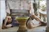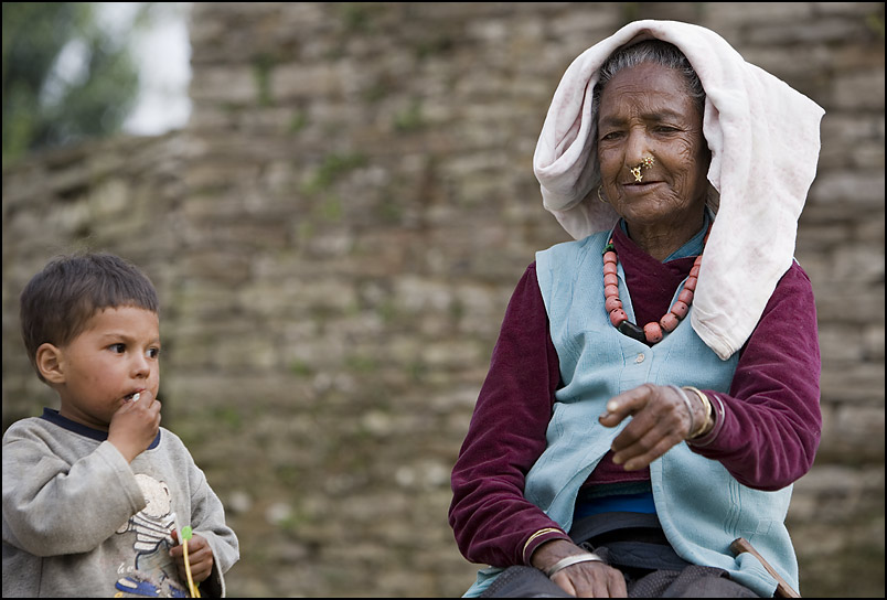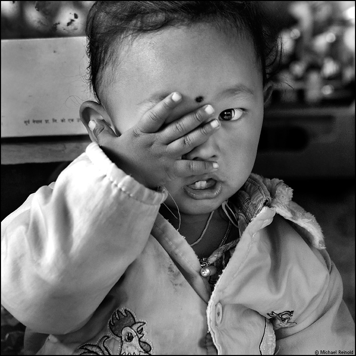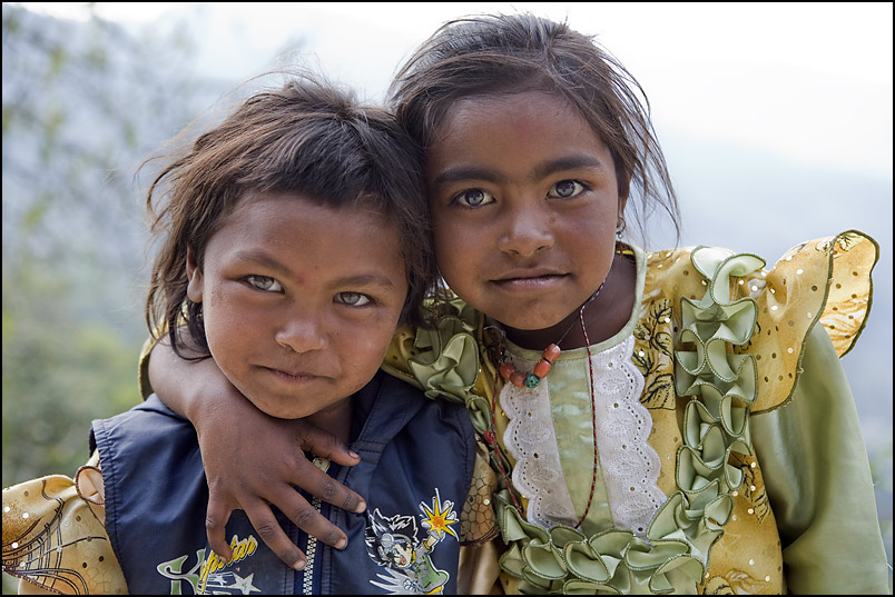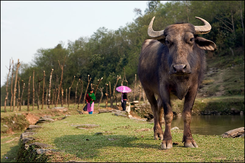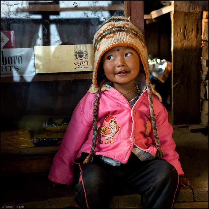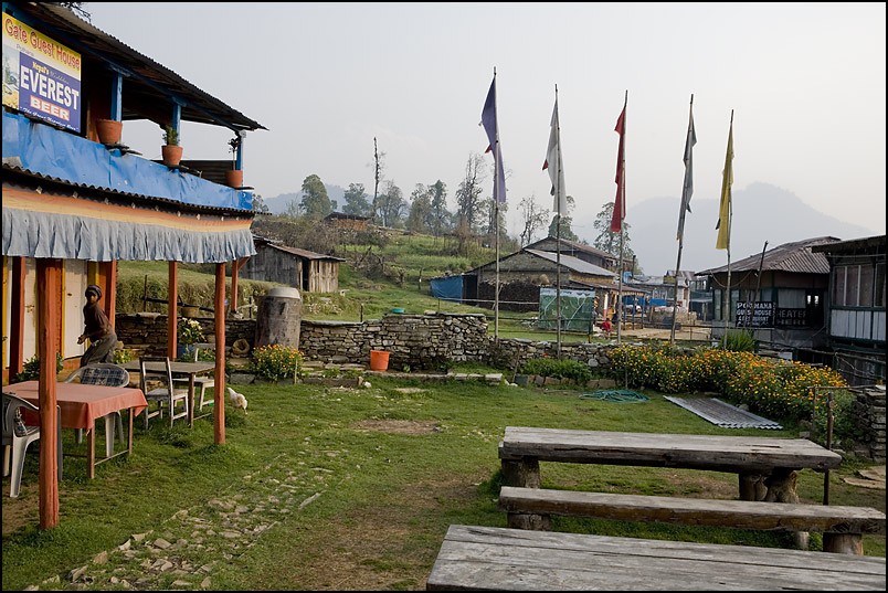 Von Dhampus geht es dann weiter zu unserem heutigen Tagesziel. Pothana liegt noch einmal knapp 2 Stunden entfernt. Nicht mehr ganz so steil wie zu Beginn des heutigen Tages geht es über einen „Plattenweg“ hinauf bis auf knapp 1900 Meter. Nur kurz vor Pothana müssen wir noch einmal auf die Zähne beißen und einen letzten kurzen aber steiler Schlussanstieg bewältigen. Leider sind die Rhododendronwälder durch die wir gehen auf dieser Höhe bereits verblüht. Immer wieder hört man zwischen den Bäumen ein Knacken. Eine Kuhherde vergnügt sich im Schatten der Bäume und sucht nach Essbarem. In Pothana beziehen wir Zimmer im „Heavens Gate Guest House“, einer sehr schönen Lodge. Der Abend wird richtig lustig. Prem holt sich von den Lodgebesitzern eine kleine Trommel und dann singen wir gemeinsam Lieder, die wir bereits im letzten Jahr bei unserer Mustang-Tour kennen gelernt haben. Die Lodgebesitzer und deren Kinder haben ihren Spaß und einige Touristen, die noch an der Lodge vorbeikommen, schauen neugierig herein, was denn da so abgeht. Eine Gegenkirmes für Dhampus? Die kleine Tochter des Hauses entwickelt im Laufe des Nachmittags echte Modelqualitäten und hat sichtlich Spaß fotografiert zu werden.
