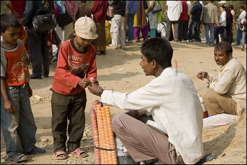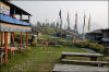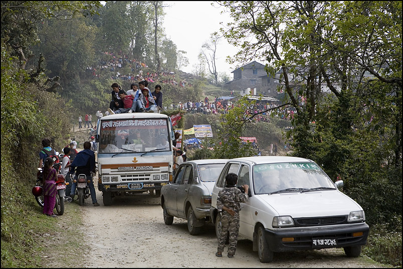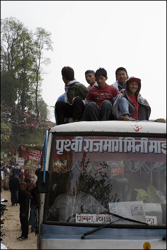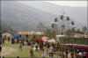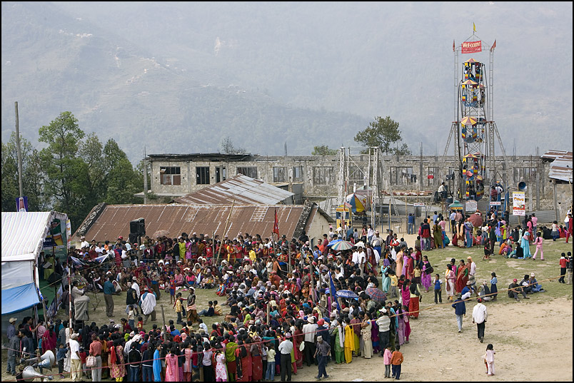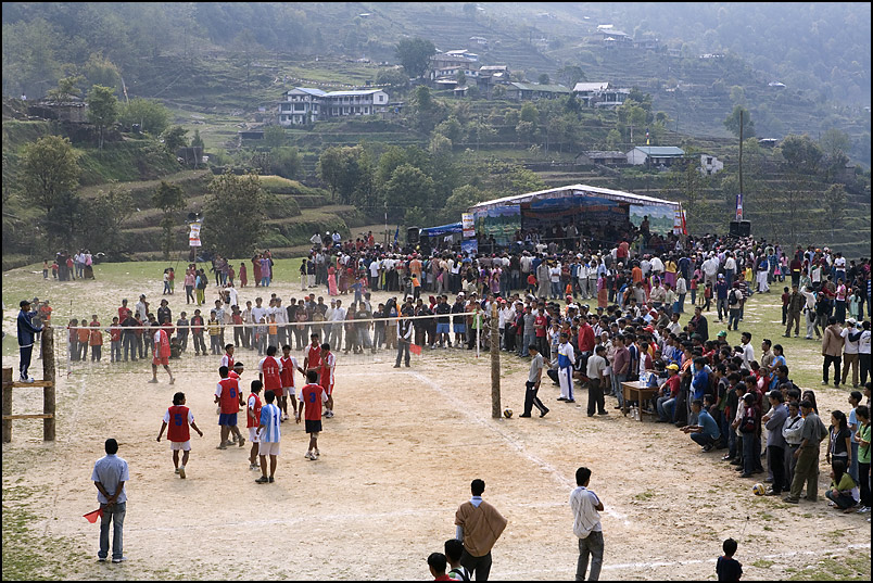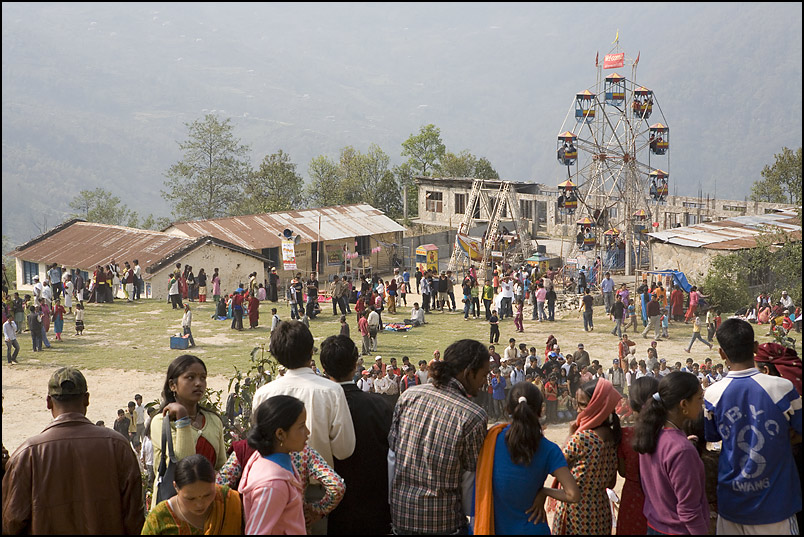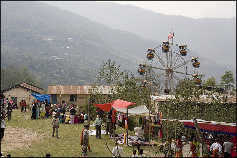 Am Ortsanfang machen wir eine kleine Pause mit einer leckeren Nudelsuppe. Während der Pause werden wir schon gefragt, ob wir zum Dorffest gekommen seien. Darunter können wir uns zunächst einmal nichts vorstellen. Als wir jedoch nach der Pause weitergehen und ans andere Ende des Dorfes kommen, hören wir plötzlich laute nepalische Musik. Groß ist unsere Erstaunen, als wir um die Ecke biegen. Der ganze Berghang ist voller Menschen, die auf einen Platz schauen, auf dem sich ein Riesenrad (!) und eine Schiffsschaukel befinden. Außerdem gibt es ein Volleyballfeld, auf dem zwei Mannschaften unter lauter Anfeuerung der Bevölkerung gegeneinander spielen. Am Wegesrand werden unterschiedliche Leckereien angeboten. So etwas erwartet man nicht unbedingt in den Bergen des Himalaya. Ich habe außerdem keine Ahnung, wie man es geschafft hat, besonders das Riesenrad hier hin zu bekommen.