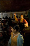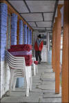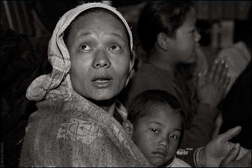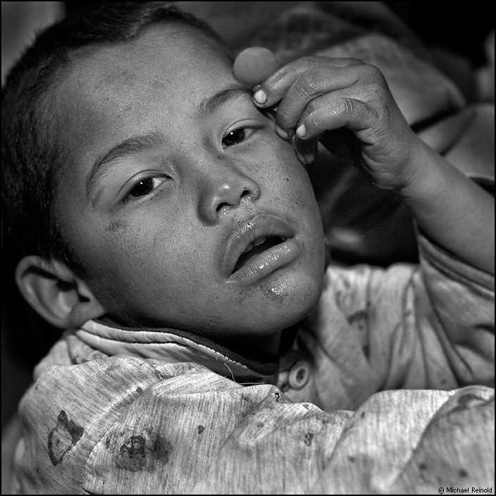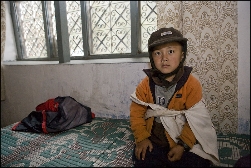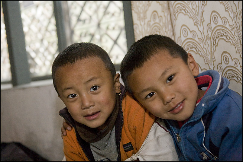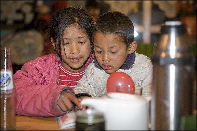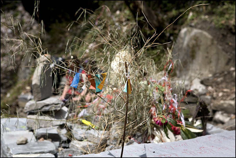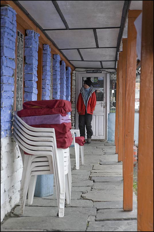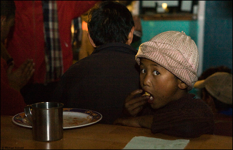 Kurz vor Doban kommt uns Birjar entgegen um uns mitzuteilen, dass es Prem überhaupt nicht gut geht. Als wir Prem sehen, erschrecken wir uns erst einmal. Er zittert wie Espenlaub, versucht aber krampfhaft uns nicht zu zeigen das er krank ist. Er wird zunächst einmal weiter mit Paracetamol versorgt. Danach plündern wir unsere Rucksäcke und packen ihn in eine warme Hose und ein dickes Fleece. Als er jedoch hört, dass er ab sofort kein Gepäck mehr trägt, versucht er sofort abzuwehren. Verständlich aus nepalisches Sicht, wenn man weis, dass Träger in der Regel bei Krankheit auch keinen Lohn erhalten. Erst als wir ihm sagen, dass er sich deshalb keine Sorgen zu machen braucht, beruhigt er sich wieder. Versorgt mit einer zusätzlichen Getränkeflasche macht sich Prem langsam auf den Weg in Richtung Bamboo, wo wir die Mittagspause geplant haben. Das Gepäck von Prem wird kurzfristig aufgeteilt, da wir in Doban keinen neuen Träger bekommen. In Bamboo werden wir unser Glück noch einmal versuchen. Bamboo scheint irgendwie für uns kein Glücksort zu sein. Denn kaum haben wir die Lodge von Bamboo betreten, die uns vom Unwetter des Hinweges noch gut in Erinnerung ist, fängst es wie aus heiterem Himmel wieder an fürchterlich zu regen. Irgendwie ein Dejuvuerlebniss. Wir treffen die beiden Jungen der Lodgebesitzer wieder, die sich noch gut an uns erinnern. Einer von ihnen hat irgendwoher ein chinesisches Kochbuch bekommen, dass er uns stolz präsentiert. Hari schafft es inzwischen tatsächlich, in Bamboo einen neuen Träger zu finden, der das Gepäck von Prem bis nach Sinuwa, unserem heutigen Etappenziel trägt. Dort wollen wir erst einmal abwarten wie es Prem geht und ggf. morgen wieder nach einem neuen Träger suchen.