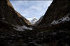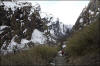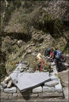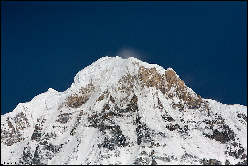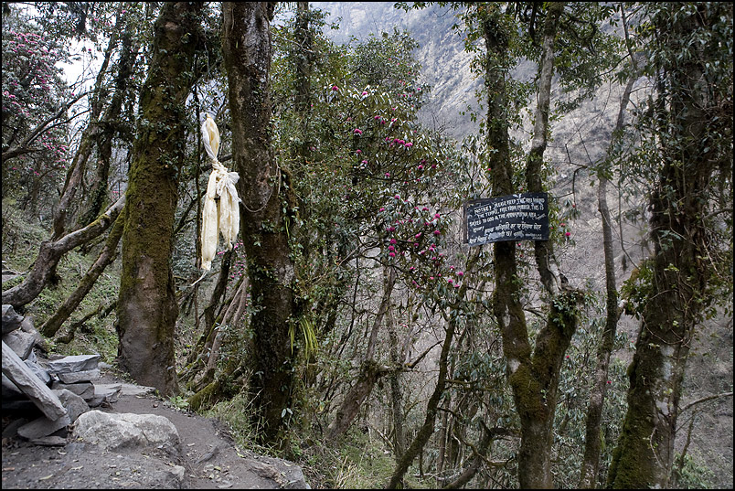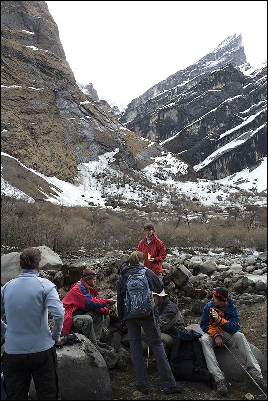 Prem, der Älteste unserer Träger, scheint sich gestern bei dem schlechten Wetter verkühlt zu haben. Hari weckt mich mit der Nachricht, dass Prem Fieber hat. Er bekommt eine Paracetamol und die Auflage viel zu trinken. Trotzdem will Prem mit dem Gepäck los marschieren. Die ganzen Schneefelder über die wir gestern aufgestiegen sind, sind heute Morgen hart gefroren und erweisen sich bei unserem Abstieg streckenweise als eine echte Herausforderung. Gerade an den etwas exponierten Stellen ist größte Vorsicht geboten. Wenn man hier abrutscht gibt es kein Halten mehr. Unsere Planung, dass der Abstieg wesentlich schneller als der Aufstieg wird, ist so nicht zu halten. Tatsächlich brauchen wir bis zum Himalaya Hotel länger als für den Aufstieg. An einer Stelle habe ich richtig Glück. Meine Fototasche, die seitlich am Rucksack aufgeschoben ist, rutscht an einer besonders heiklen Stelle zur Seite und bringt mich aus dem Gleichgewicht. Ich habe Glück, dass ich mich mit einer Hand an einer dicken Eiswulst festhalten kann.
