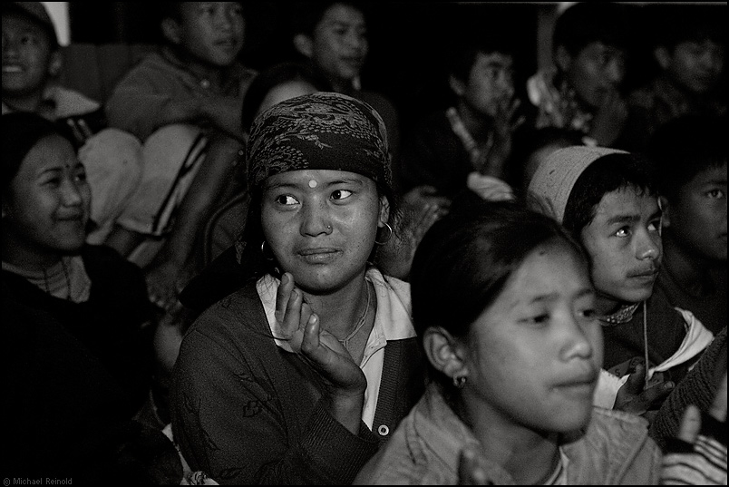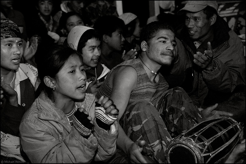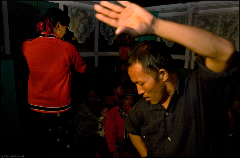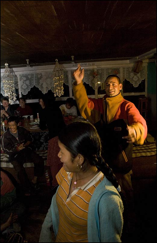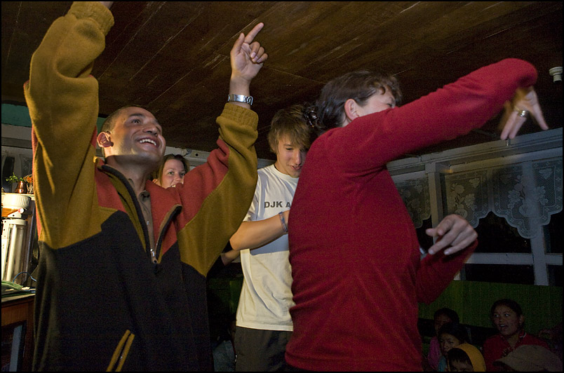 Es scheint sich wieder einzuregnen und so beschließen wir, unsere Regensachen auszupacken und wieder im Regen loszugehen. Zum Glück lässt der Regen dann doch schnell nach und als wir den einzigen Anstieg des heutigen Tages von Bamboo in Richtung Sinuwa von 200 Höhenmetern überwundern haben, sehen wir über dem Tal des Modi Khola einen gigantischen Regenbogen. Wer kann schon von sich behaupten einmal über dem Regenbogen gestanden zu haben. Im oberen Teil von Sinuwa machen wir noch einmal eine kleine Trinkpause, sehen aber dann, dass sich am Himmel wieder etwas zusammen braut und sprinten dann abwärts in Richtung der Lodge in unteren Teil des Ortes, die Hari beim Hinweg bereits ins Auge gefasst hatte. Genau im dem Augenblick als wir die Lodge betreten bricht das Unwetter los. Eine Minute später und wir wären völlig durchnässt gewesen. Wir sind die Einzigen in der Lodge, beziehen unsere Zimmer und richten uns dann gemütlich im Speiseraum der Lodge ein. Prem geht es deutlich besser. Die Medikamente scheinen ihre Wirkung zu zeigen. Als es draußen langsam dunkel wird, öffnet sich immer wieder die Tür der Lodge und es kommen sehr viele Einheimische herein. Jung und Alt, männlich und weiblich, alles findet sich ein. Die Bewohner des kleinen Ortes wollen uns eine Art Folkloreabend präsentieren. Mit Trommeln, Gesang und Tanz werden wir nun unterhalten und nach einer kurzen Zeit auch zum Tanzen aufgefordert. Es wird ein richtig lustiger Abend. Auch Birjar, Sandra und sogar der kranke Prem tanzen und singen mit. Zum Abschluss wird uns allen ein Blumenkranz umgelegt. Mit einer Spende für die Dorfkasse bedanken wir uns für den netten Abend.