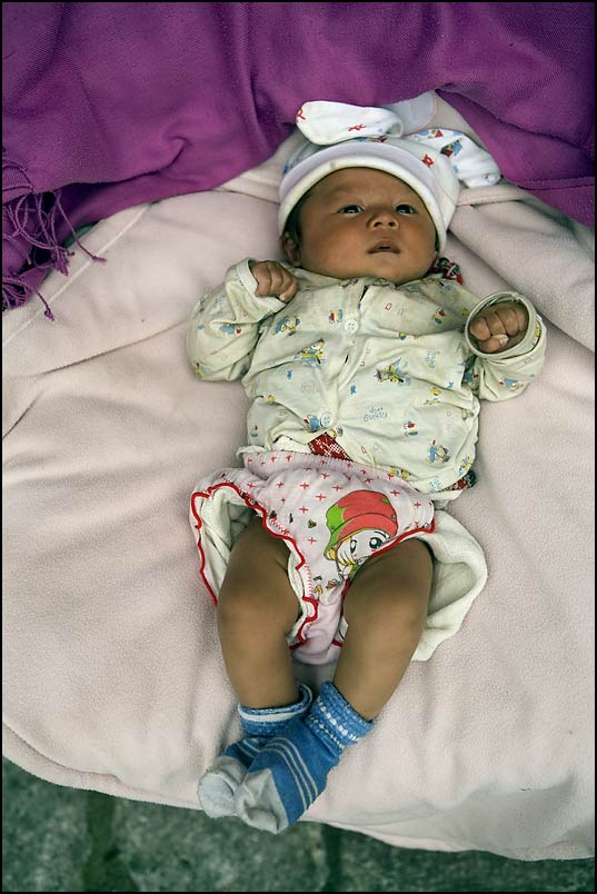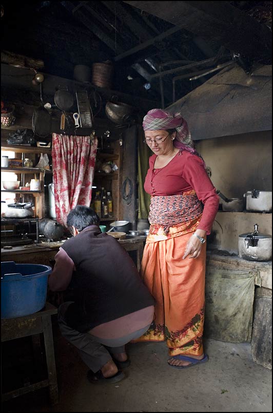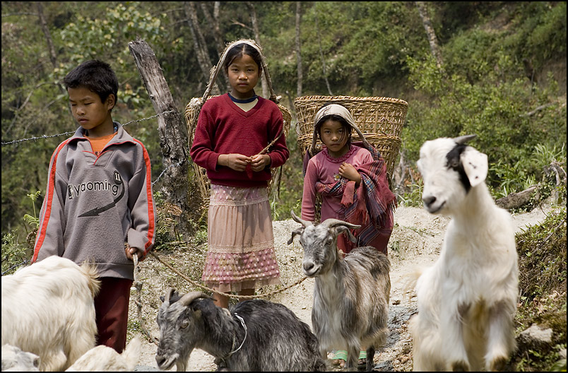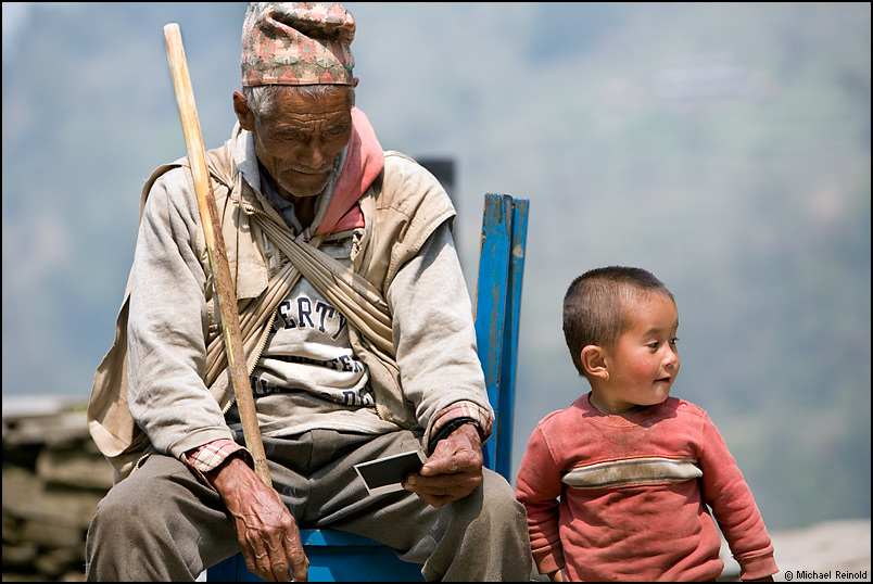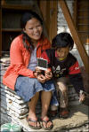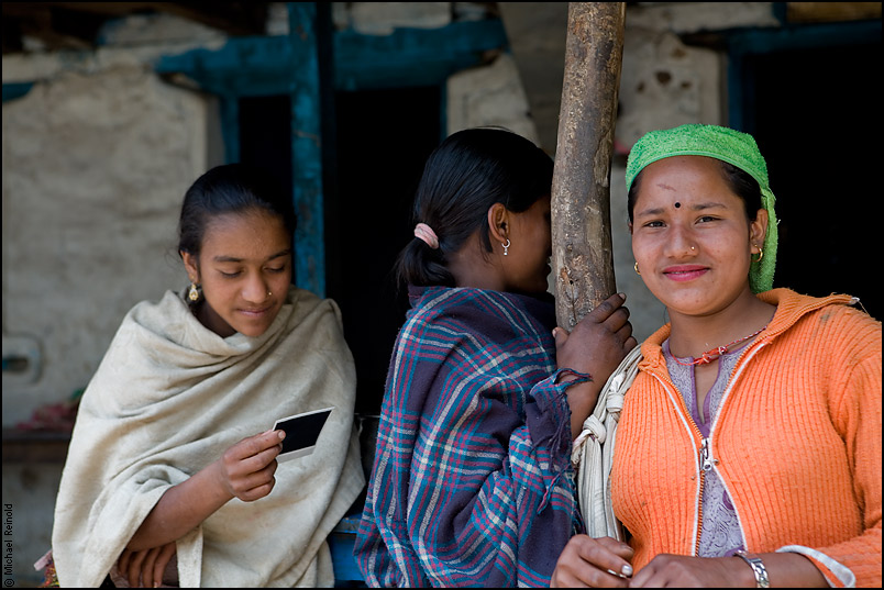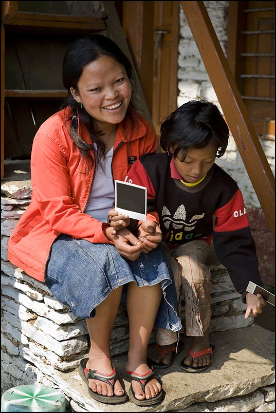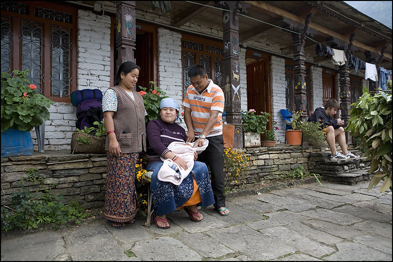 Von Tolka aus erreicht man in einer guten Stunde immer leicht bergab gehend Landrung, das auf einer Höhe von ca. 1600 Metern liegt. Landrung ist ein größerer Ort mit vielen Lodges. Auf der gegenüberliegenden Bergseite sieht man Ghandrung liegen, unser letztes Etappenziel auf dieser Tour. Aber bis dahin ist noch etwas Zeit. Bei der großen Auswahl an Lodges ist es nicht schwer Zimmer zu bekommen. Die Lodge für die wir uns entscheiden wird von Mutter und Tochter bewirtschaftet, wobei die Tochter gerade entbunden hat und uns stolz ihren 1 Monat alter Säugling zeigt. Mein Freund Gerd, der auf dieser Tour seinen Nepaleinstand feiert, hat eine Polaroidkamera und genügend Filmmaterial mitgenommen. Als er damit Fotos des Säuglings, der Eltern und der Grosseltern macht, ist die Freude natürlich entsprechend groß.