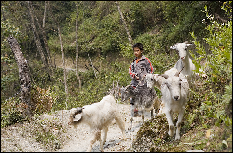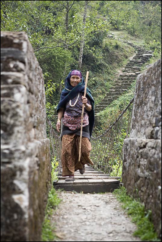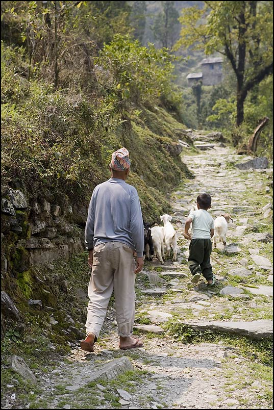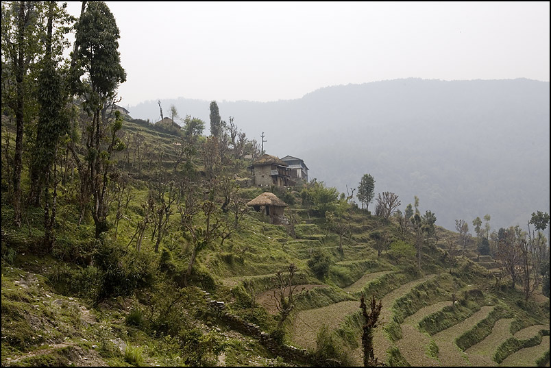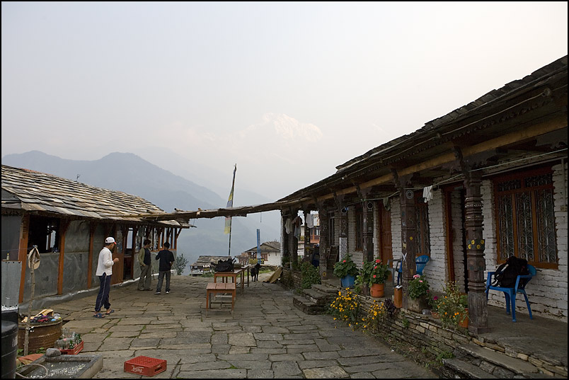 Tolka - Landrung Ein Doppelklick auf ein Foto vergrößert das Bild! Laut Reiseführer hat man von Pothana aus einen wunderschönen Blick auf den Machapuchre, den dominierenden Berg dieser Region. Das Wetter ist zwar schön, aber leider so diesig, dass man von den Bergen kaum etwas sieht. Nach dem Frühstück geht es los in Richtung Landrung, unserem heutigen Etappenziel. Den heutigen Tag können wir gemütlich angehen lassen, denn unser Tagesziel liegt nur ca. 4 Stunden entfernt. Entsprechend viele kleine Pausen werden wir heute einlegen. Auf einem sehr schönen Weg geht es in 45 Minuten leicht bergauf bis nach Deurali, wo wir einen Tee zu uns nehmen.