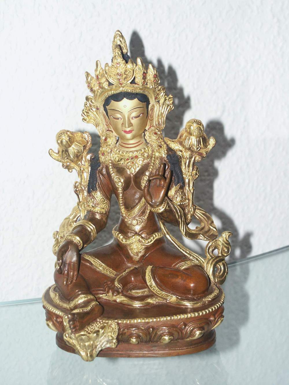 Tara-Dolma Tara-Dolma oder auch die "Grosse Göttin" ist eng mit Tschenresi verbunden. Sie gilt als weiblicher Aspekt seiner Fürsorge. Mit ihren vielfältigen Kräften bewahrt sie vor allen Ängsten. Sie schützt vor giftigen Tieren, vor Räubern, vor Krankheit, vor Blitz und Feuer. Das alles zeigt, dass sie im Buddhismus als eine der mächtigsten Schutzherrinnen gilt. Darstellung: Die rechte Hand wird offen nach unten, die linke Hand offen nach oben gehalten. Sie sitzt, wobei das linke Bein flachliegend angezogen und das rechte Bein im Unterschenkel abgewinkelt ist. Der Fuß liegt oftmals auf einem kleinen Lotuspodest.