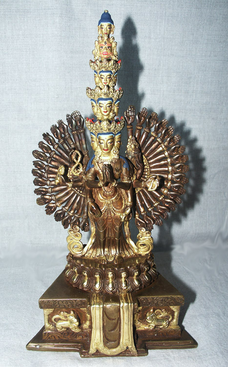 Avalokitesvara oder Tschenresi , wie er vor allem in Tibet genannt wird, ist der Bodhisattva des Mitgefühls. Er wird meisten elfköpfig dargestellt. Der Legende nach spaltete sich sein Kopf, bei dem Gedanken an die Vielzahl der noch zu erlösenden Wesen. Außerdem wird seine Darstellung immer mit vielen Armen dargestellt, wobei jede Hand zusätzlich ein Auge hat, was auch die ständige Wachsamkeit und Besorgnis um die lebenden Wesen symbolisiert. Er hat auch das heilige Mantra "Om mani padme hum" nach Tibet gebracht und die Gebete der Gläubigen richten sich mit dem Zitieren dieses Mantras an Tschenresi. Zuletzt genießt Tschenresi in Tibet natürlich auch deshalb so viel Verehrung, weil der Dalai Lama als Inkarnation von Avalokitesvara gilt.