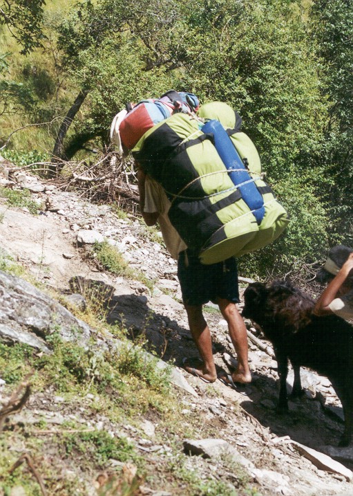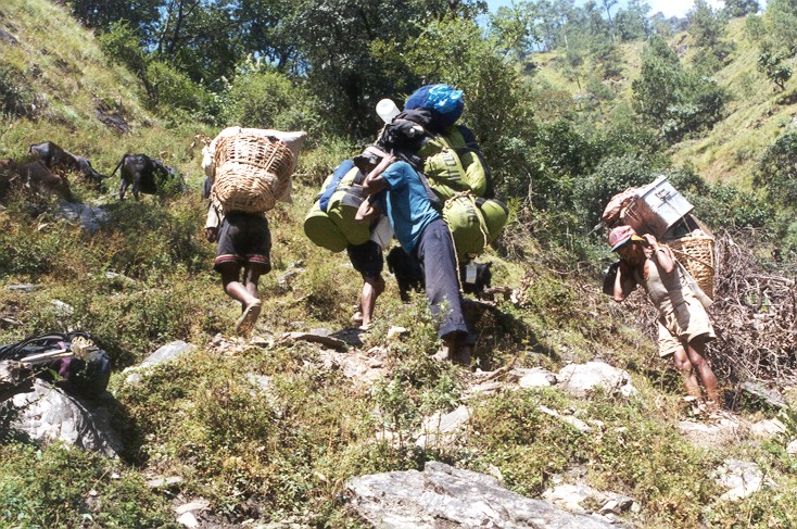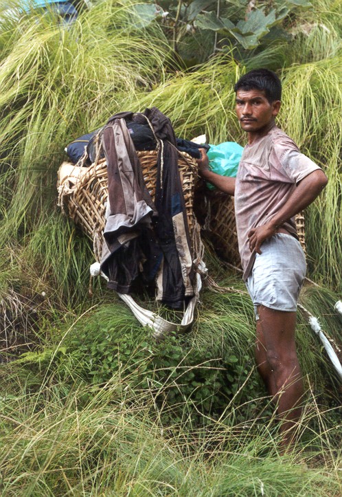 ich unsere Träger, die auch hier mit ihren Badeschlappen und dem schweren Gepäck