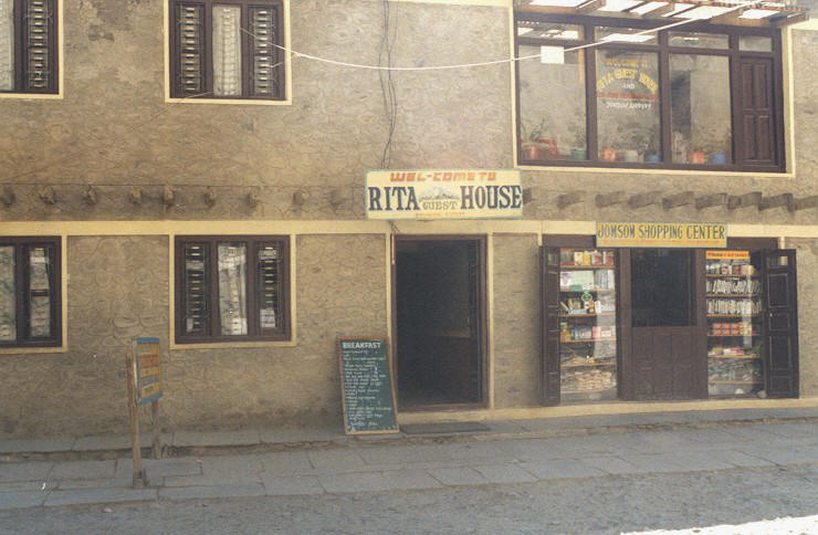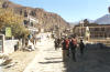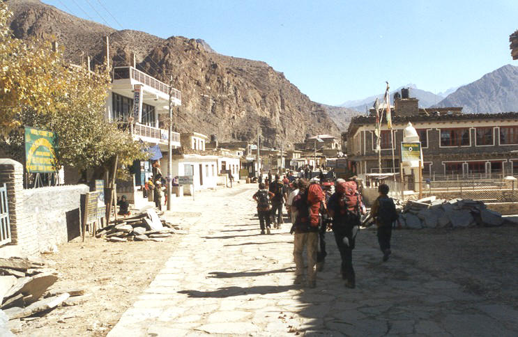 Jomosom Ein Doppelklick auf ein Foto vergrößert das Bild! Die letzte Etappe steht an. Unser heutiges Ziel Jomosom liegt nur 200 Höhenmeter und knapp 1,5 Stunden Gehzeit entfernt. Gemütlich machen wir uns am Morgen auf den Weg und nehmen uns Zeit, bei einigen Straßenhändlern anzuhalten und noch das ein oder andere Souvenir zu kaufen. Auf dem Weg von Marpha nach Jomosom In Jomosom befindet sich der Flughafen des Tales. Bedingt durch den starken Wind, der jeden Nachmittag durch das Kali Gandaki Tal fegt, finden die Flüge nach und von Pokhara meist am Vormittag statt. Entsprechend viele Flieger sehen wir auch heute Morgen auf unserem Weg nach Jomosom. Der Ort ist für Nepal völlig untypisch. Eine breite Strasse durchzieht den Ort und die Häuser rechts und links vermitteln eher den Eindruck als wäre man im Wilden Westen und nicht im Himalaya. Marpha hat mir deutlich besser gefallen. Ortsdurchgang von Jomosom Die Arbeit wird mit aller Ruhe durchgeführt Blick von der Brücke von Jomosom auf die Landebahn des Flughafens Wir beziehen Quartier im "Rita Guest House". Die Lodge befindet sich direkt am Flughafen, aber da nachmittags kein Flugverkehr stattfindet, stört dies nicht. Am nächsten Morgen hat es dafür den Vorteil, dass wir unser Gepäck nicht durch den ganzen Ort schleppen müssen. Bei unserer Besichtigungstour durch Jomosom stoßen wir auf eine Gurkha-Kaserne. Mein Versuch ein Foto von der Wache in der typischen Gurkha-Uniform zu machen, wird nicht geduldet. Meine Abneigung gegen Militär wird wieder einmal bestätigt. Rita Guest House, Lodge direkt am Flughafen Am nächsten Morgen heißt es nun endgültig Abschied nehmen von den Bergen. Mit einer kleinen Twin-Otter Propellermaschine geht es am Morgen zurück nach Pokhara. Der Security-Check am Flughafen entpuppt sich als Witz. Ich werde gefragt, ob ich ein Messer oder ein Feuerzeug bei mir haben. Als ich beides verneine, kann ich passieren; keine weiteren Kontrollen. Der 20 minütige Flug durch das Kali Gandaki Tal nach Pokhara ist dafür ein überwältigendes Erlebnis. Zwischen den beiden Achttausendermassiven von Dhaulagiri und Annapurna haben wir einen traumhaften Flug mit tollen Ausblicken. Bei der Platzwahl hat man die Qual der Wahl. Auf der linken Flugzeugseite blickt man auf Annapurna, Nilgiri und Machapuchare, auf der rechten Flugzeugseite genießt man den Ausblick auf den Dhaulagiri. Eine traumhafte Tour ist nun zu Ende. Eine Tour, die zwar häufig sehr anstrengend war und viel Schweiß gekostet hat, die auch fürchterliche Erlebnisse in mir wachruft, die aber mit ihren positiven Eindrücken für all dies entschädigt. Die vielen freundlichen und hilfsbereiten Menschen denen wir begegnet sind, die tollen Ausblicke und Landschaftseindrücke die wir hatten und die Zeit die man für sich selber hatte, möchte ich nicht missen. Flughafen von Jomosom Blick aus dem Flugzeug kurz nach dem Start in Jomosom auf das Kali Gandaki Tal Im Flugzeug der Cosmic Air Blick aus dem Flugzeug auf den Machapuchare