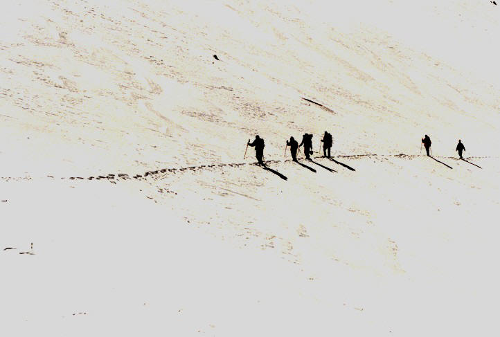 Nach einer Pause steigen wir über ein breites Schneefeld ca. 300