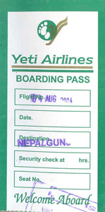 Die Menschen in Kathmandu hatten uns schon vor den Temperaturen in Nepalgunj gewarnt. Es sei sehr viel wärmer als in Kathmandu, und dort war es Ende Juli schon sehr warm. Als wir im Landeanflug auf Nepalgunj sind, bekommen wir schon einen ersten Eindruck. Die Temperatur im Flieger nimmt ständig zu und bei der Landung ist der ganze Körper bereits mit einer feuchten Schicht überzogen. Der Monsun gibt sich auch bei unserer Ankunft die Ehre; genau in dem Moment als wir das Flugzeug verlassen, bricht der Regen los. Ein wenig Rettung bietet nur der Flügel des Flugzeuges, unter dem wir alle Deckung suchen. Als der Regen etwas nachlässt, werden wir einzeln mit Regenschirmen vom Flughafenpersonal ins Flughafengebäude gebracht. Da der Weiterflug nach Juphal erst am nächsten Morgen ist, soll uns ein Bus zu einem Hotel am anderen Ende von Nepalgunj bringen. Leider war es mir nicht möglich den Bus zu fotografieren; er wäre es wert gewesen! Während der regenreichen 20minütigen Fahrt, mussten wir im Bus den Regenschirm aufspannen, weil es durch das Dach regnete. Nepalgunj selbst zieht sich sehr lange an einer einzigen Hauptstrasse entlang. Die Strassen sind bei unserer Hinfahrt voller Matsch, da sie nicht asphaltiert sind, aber bereits am nächsten Morgen, nach einer längeren Regenpause, staubt es auf der gleichen Strasse wie verrückt. Was man rechts und links zu sehen bekommt ist zum Teil unglaublich. Kinder, die riesige Karren durch die Strassen ziehen, kleine eingefallene Hütten, in denen Menschen leben, unzählige Rikschafahrer. Als wir unser gebuchtes Hotel erreichen, teilt man uns mit, dass es wohl einen Buchungsfehler gegeben hat und das Hotel leider voll ist. Man verweist uns auf ein anderes Hotel einige Häuser weiter. Das erste Hotel gehörte schon zur nepalischen Kategorie "einfaches Hotel". Was uns jetzt erwartet, ist in keine Kategorie mehr einzuordnen. Man hat das Gefühl das Haus wurde nur für uns noch einmal zum Hotel erklärt. Die Glühbirne, die von der Decke hängt, wirft ein wenig Licht auf die Matratzen in unserem Zimmer. Aber wie sich in der Nacht herausstellt, "lebt die Matratze", wie zahlreiche Flohbisse beweisen. Das angebotene Frühstück am nächsten Morgen entschädigt leider auch nicht für die Nacht. Zum Glück ist bereits um 4 Uhr wecken, da unserer Weiterflug nach Juphal bereits in den frühen Morgenstunden starten soll. Da es sich hierbei um einen Sichtflug handelt, muss das Wetter mitspielen. Da es ziemlich bewölkt ist, wissen wir noch nicht, ob unser Flug tatsächlich startet. Ein Horror - ein weiterer Tag in Nepalgunj. Beim "einchecken" im Flughafen erleben wir dann die ganze Idiotie nepalischer Behörden. Unsere Seesäcke werden per Hand durchsucht, für unsere Rucksäcke, die wir als Handgepäck mitführen, interessiert sich keiner. Dafür müssen wir in einer kleinen Kabine diverse Personaldaten eintragen, z.B. die Reisepassnummer und die Visanummer. Da der Reisepass mit Visum eingeschlossen im Hotelsafe in Kathmandu liegt, trage ich meine Telefonnummer als Reisepassnummer ein. Ob ihr es glaubt oder nicht, kontrolliert wird das ganze nicht. Zum Glück bessert sich das Wetter etwas und gegen 8 Uhr können wir unseren Flug nach Juphal starten. |