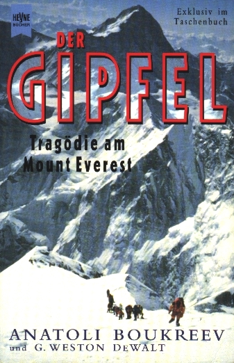 Das Buch von Anatoli Boukreev, beziehungsweise von Weston deWart, der die Geschehnisse vom 10.Mai 1996 aus seiner Sicht schildert, ist nur als Taschenbuch erhältlich. Anatoli Boukreev war Bergführer der kommerziellen Expedition von Scott Fischers Mountain Madness. Er wurde für sein Verhalten während der Expedition und besonders am Gipfeltag, in dem Buch von Jon Krakauer heftig kritisiert. Boukreev schildert die Ereignisse hier aus seiner Sicht. Dabei versucht Boukreev immer wieder, sein Verhalten während der Expedition zu rechtfertigen. Das Buch ist ebenfalls sehr spannend zu lesen, kann jedoch vom schriftstellerischen bei weitem nicht an das Buch von Krakauer reichen. Den besonderen Reiz macht es aus, das Buch im Anschluss an Krakauer zu lesen, um die beiden unterschiedlichen Darstellungen besser miteinander vergleichen zu können. Boukreev hat in der Nacht der Katastrophe zahlreichen Bergsteigern das Leben gerettet und ist für diese Tat auch ausgezeichnet worden, jedoch drängte sich mir mehrmals beim Lesen des Buches der Verdacht auf, das Boukreev diese Aktionen auch aus einem schlechten Gewissen heraus machte. Sein Verhalten am Gipfeltag, ohne Sauerstoff aufzusteigen, war zwar aus sportlicher Sicht eine tolle Leistung, aber, und da stimme ich Krakauer voll zu, unter dem Aspekt das er als Bergführer für die Sicherheit und Unterstützung der Teamteilnehmer angeheuert wurde, nicht besonders professionell.