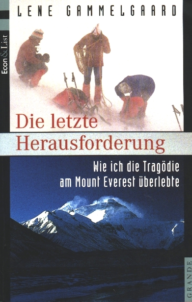 Das Buch von Lene Gammelgaard ist das dritte, und bisher letzte Buch von Mitgliedern der beteiligten Teams an der Everestkatastrophe des Jahres 1996. Sie war zahlendes Mitglied der Expedition von Scott Fisher. Mit der Besteigung des Everests war Lene Gammelgaard auch die erste Dänin auf dem Dach der Welt. Ihr Buch schildert natürlich genau wie die Bücher von Krakauer und Boukreev, die Ereignisse um den 10.Mai 1996, allerdings aus einer ganz anderen Perspektive. Während Krakauer nach den Ursachen der Katastrophe sucht und Boukreev seine Schilderungen immer wieder als Rechtfertigung braucht, schildert Lene Gammelgaard die Ereignisse aus ihrer weiblichen Sicht, ohne aber nach Ursachen zu suchen oder großartig zu kritisieren. Der Leser bekommt hier eine, soweit es überhaupt möglich ist, neutrale Darstellung der Ereignisse, ohne von ihr in eine bestimmte Richtung gedrängt zu werden. Nach den Bücher von Krakauer und Boukreev ist dieses Buch eine hervorragende abschließende Ergänzung für den Leser. Nach der Lektüre aller drei Bücher sollte sich der Leser eine eigene Meinung über die Katastrophe bilden können.