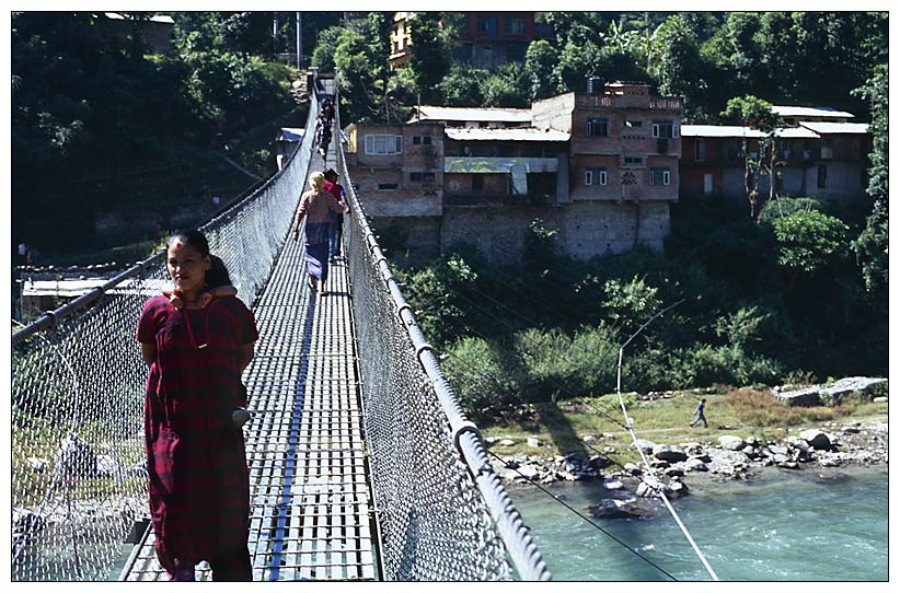 überwunden und stehen vor einer großen Hängebrücke die über den Melamchi Khola