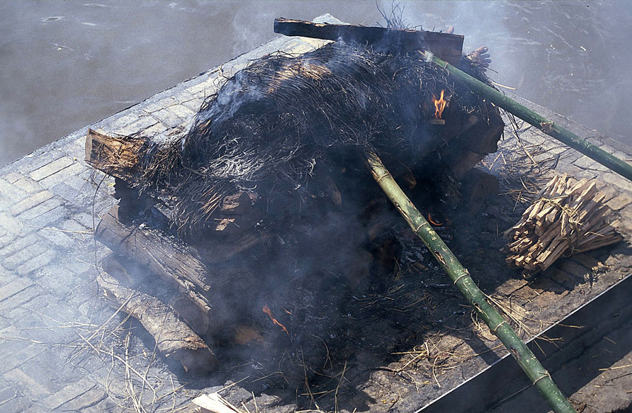 Scheiterhaufen anzuzünden. Nach ca. 3 - 4 Stunden ist die Leiche verbrannt und die Asche der Toten wird