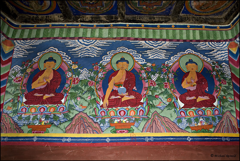 sich eine Buddhastatue und Wandmalereien der 5 Tathagata Buddhas. Nach und nach