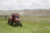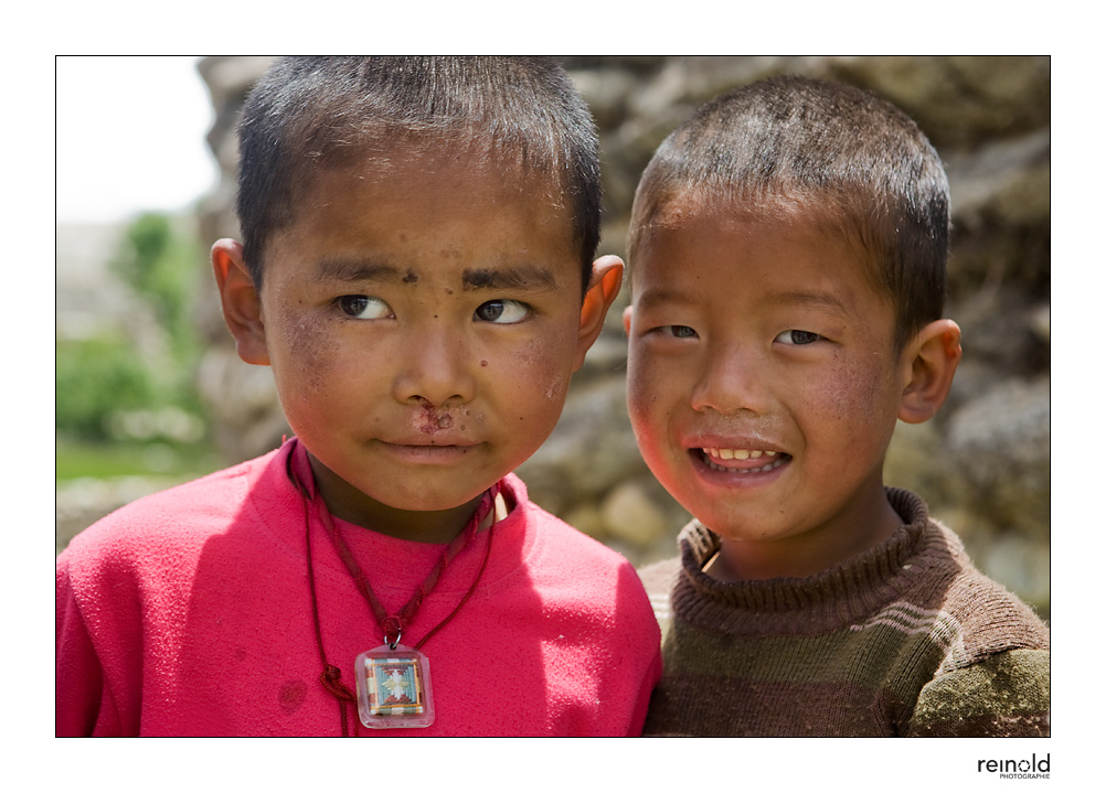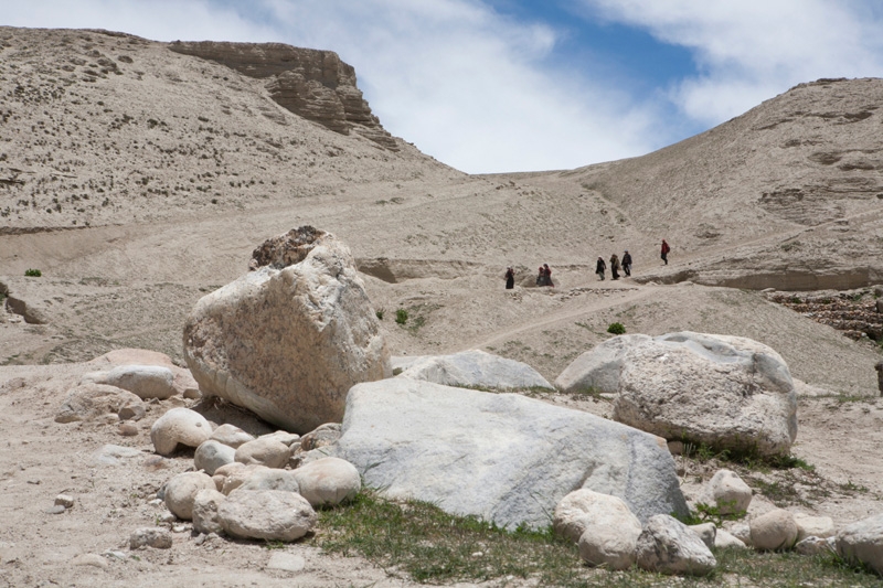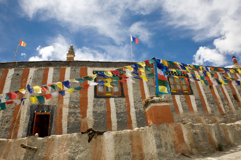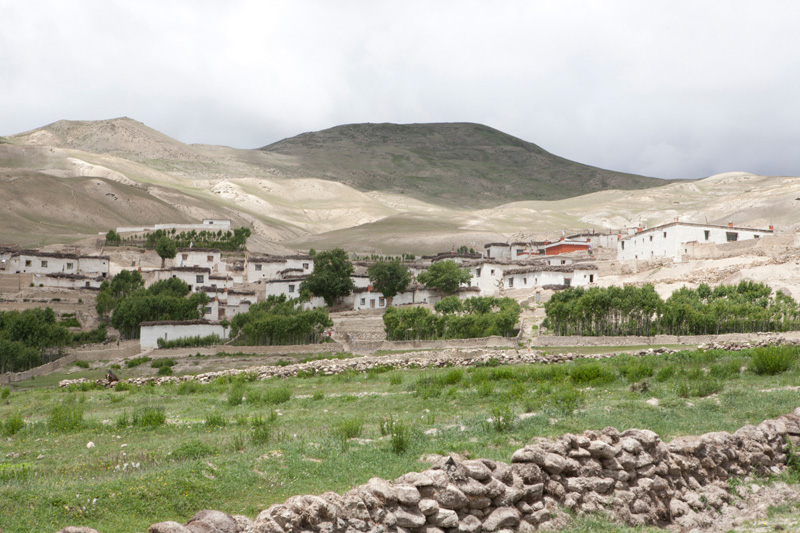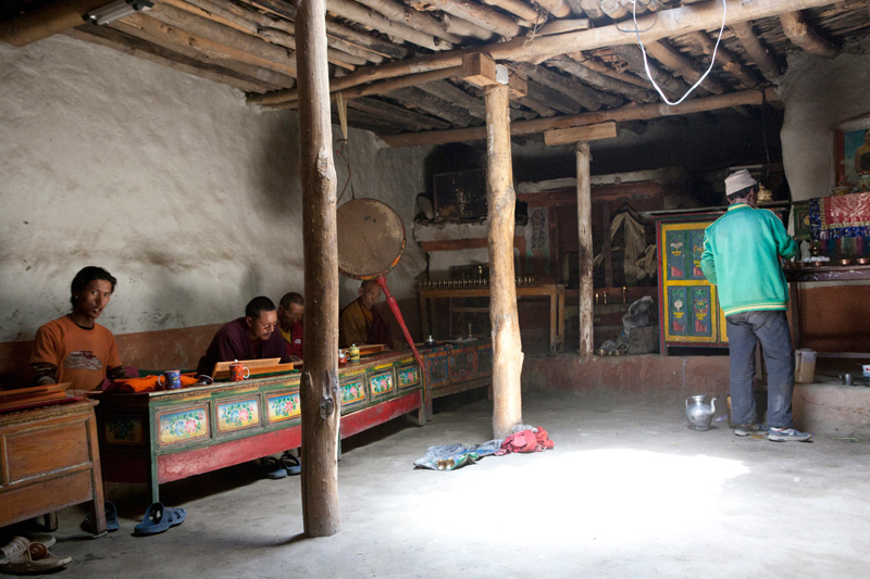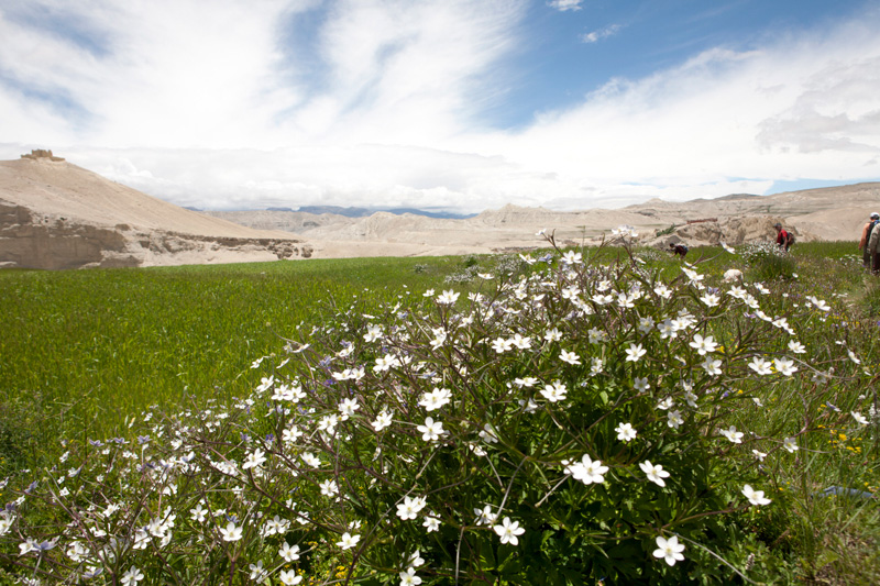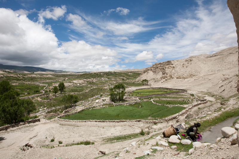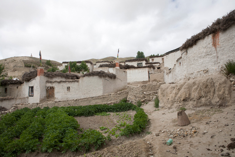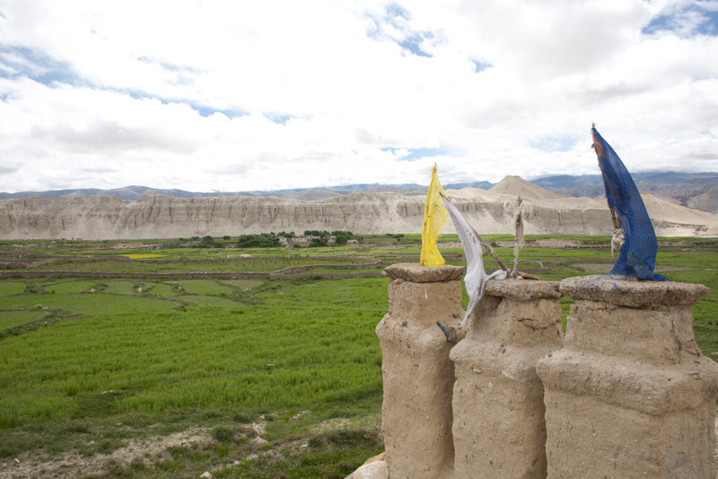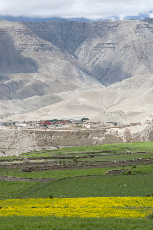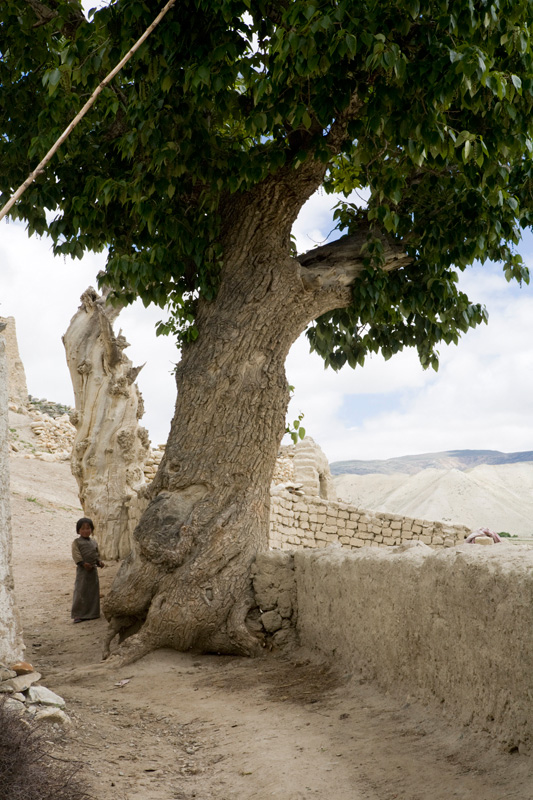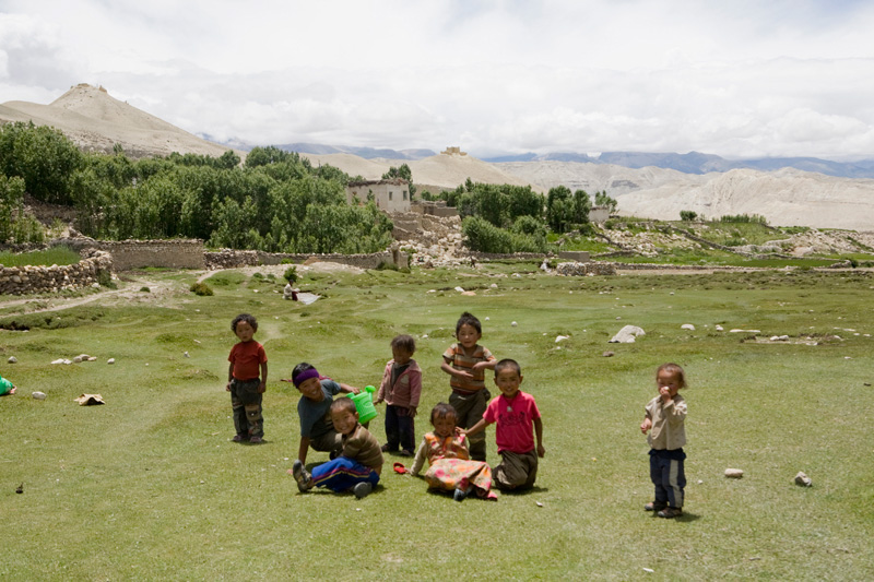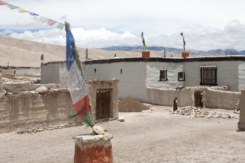 Am Ortsrand kommen wir an der Dorfschule vorbei, wo gerade Pause ist. Die Kinder scharen sich sofort um uns. Bis hier oben kommen sehr selten Touristen. Die meisten Touristen haben nur ein Genehmigung bis Lo Manthang und kommen somit nicht hier raus. Auf den umliegenden Feldern ist ein großer Traktor unterwegs. Das erste Mal, dass ich so etwas in den Bergen des Himalaya sehe. Auf unserem Rückweg machen wir nun eine Schleife über den Ort Phuwa. Hier ist in der Dorfgompa gerade eine kleine Puja, an der wir teilnehmen dürfen. Von Phuwa steigen wir wieder bergab ins Flusstal und folgen diese bis kurz vor den Hügel des Klosters Namgyal Gompa. Links steigen wir dann durch eine Art Schachte zur Gompa hoch. Kurz vor dem Kloster befindet sich noch der kleine Ort Tilekheji, der von Lo Manthang aus nicht zu sehen ist. Von Tilekheji bis zum Kloster sind es nur noch wenige Minuten bergauf.