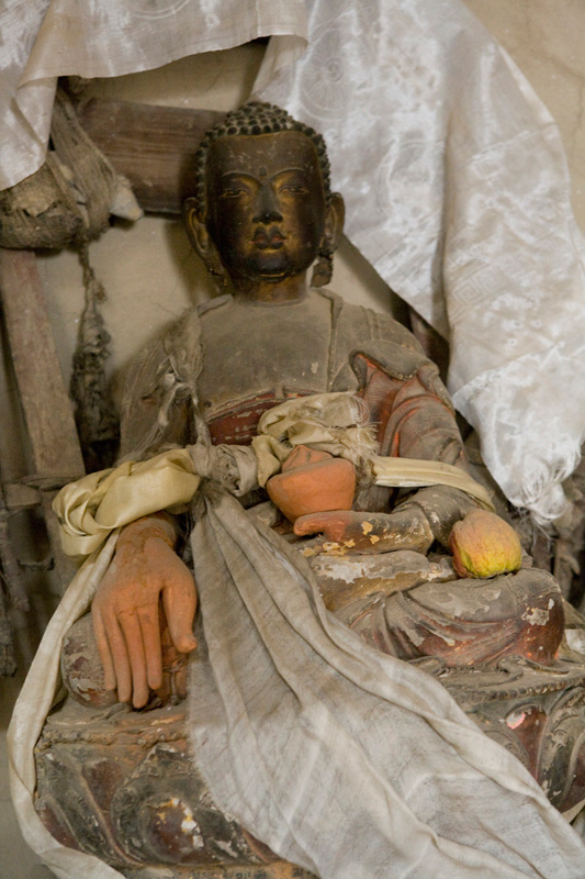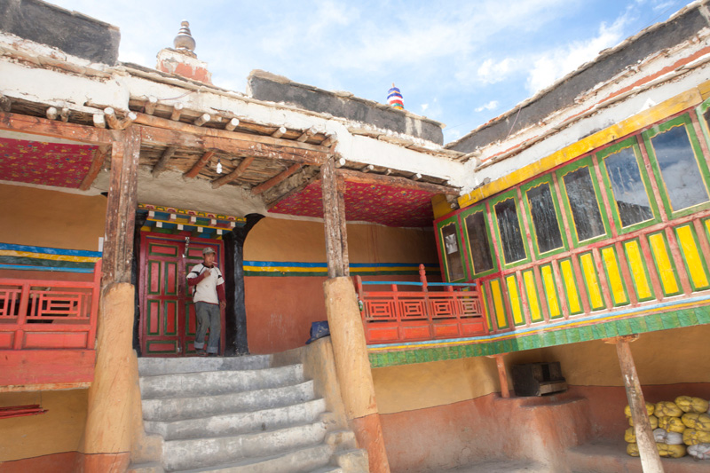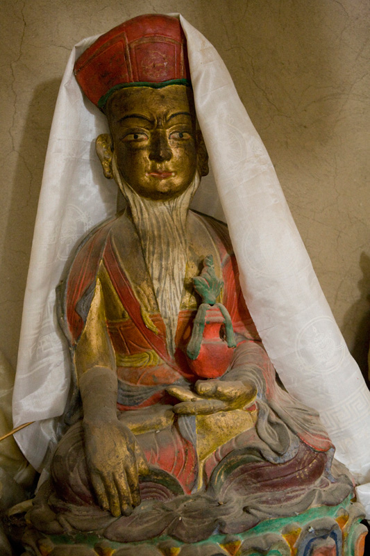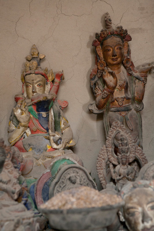 Wir haben Glück und treffen am Ortseingang eine Frau, die einen Schlüssel zur Dorfgompa hat. Die Gompa wird neu gebaut und ist noch nicht ganz fertig. Allerdings sind schon die Figuren aus der alten Gompa hier. Ich bin erstaunt, dass ich hier fotografieren darf. Für Mustang sonst völlig unüblich.