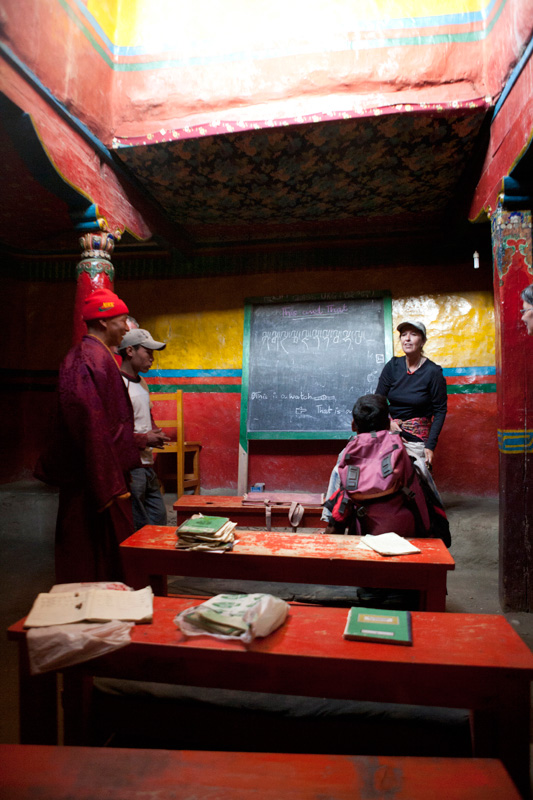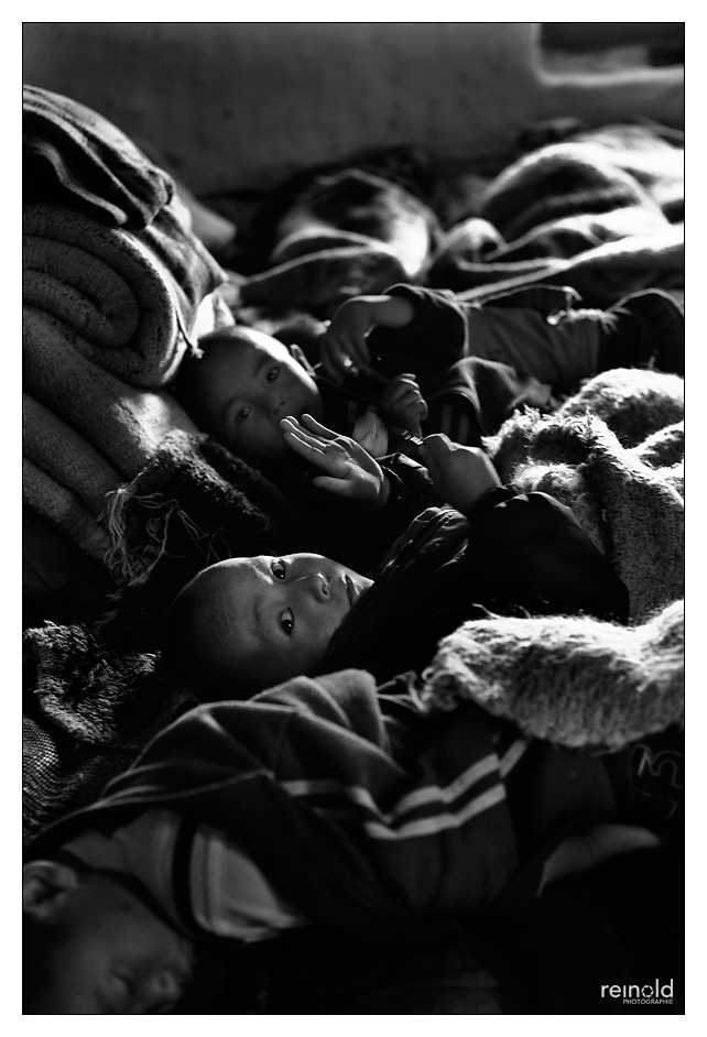 Im Klosterhof werden wir vom obersten Lama begrüßt, der modern mit einer Nikemütze auf dem Kopf bekleidet ist. Er stellt uns einen Lehrer der Klosterschule vor, der uns nun das ganze Kloster zeigt.; natürlich auch die Klassenräume und die Ruheräume der Schüler. Die kleinen Mönche schlafen meist tief und fest als wir den Raum betreten. Die Wenigen die wach sind schauen natürlich sofort neugierig unter ihren Decken hervor. Nach der Klosterbesichtigung werden wir vom Lama zu Tee und Gebäck eingeladen. Auch hier "verirren" sich nur selten Touristen hin. Umso stolzer ist der Lama uns sein Kloster zu präsentieren. Als wir uns verabschieden bekommen wir zum Abschied vom Lama noch einen Gebetsschal umgehängt.